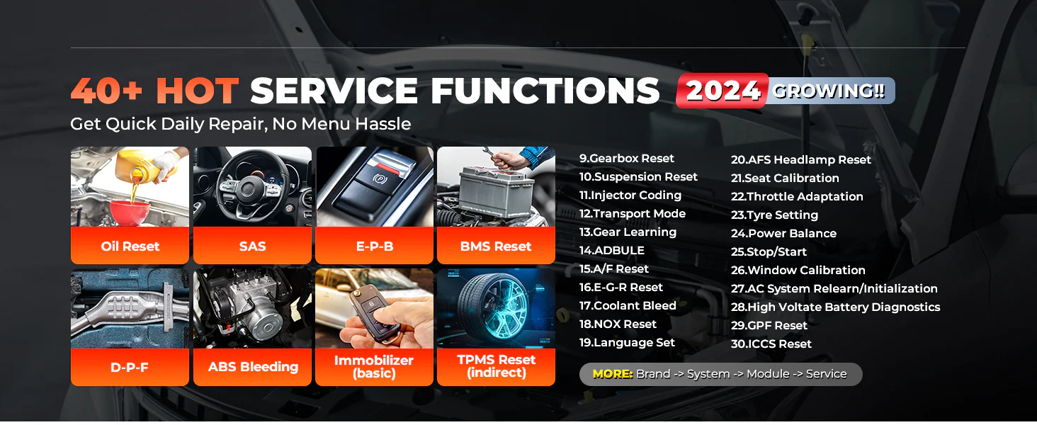 这款钥匙匹配仪同时也是一台全系统扫描仪,可对 PCM / ECM / EPS / PDM / BCM / TPM / SCCM / RADIO 等所有系统进行深度诊断。此外,它还拥有 40 多项热门服务功能,满足您的日常维护需求:如 SAS(转向角)、ABS(刹车排气)、EPB(电子手刹)、TPMS(胎压)、喷油嘴编码、电池匹配、节气门匹配等。